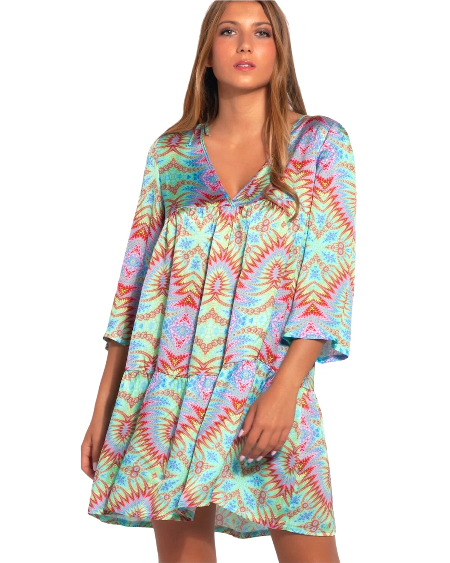 Cattura l’essenza dell’estate con l’Abito 2Bekini Fantasy Azzurro. Con il suo design vivace e colorato, le sfumature di azzurro si fondono con accenti rosa e verde in un pattern esotico. La silhouette svasata e le maniche corte offrono comfort e stile in ogni occasione. Realizzato in 100% viscosa per una sensazione leggera sulla pelle.