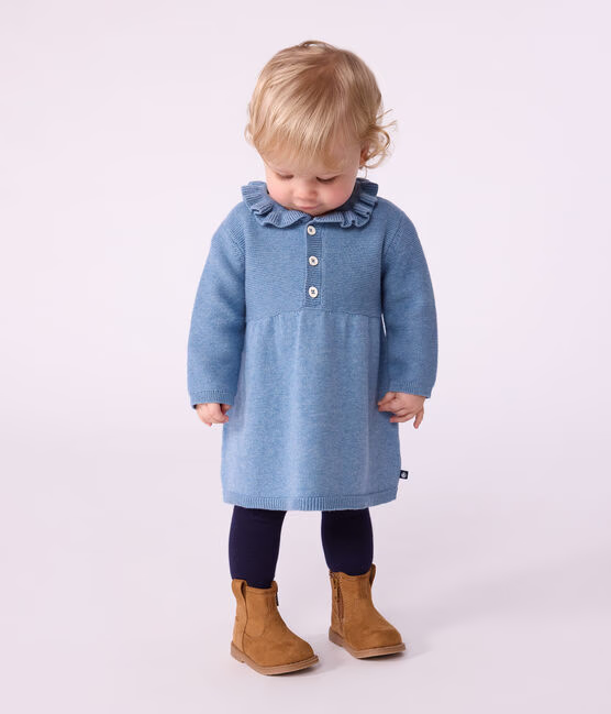 Abito bambina in morbida maglia a punto legaccio con lana, un materiale comodo per l’inverno.