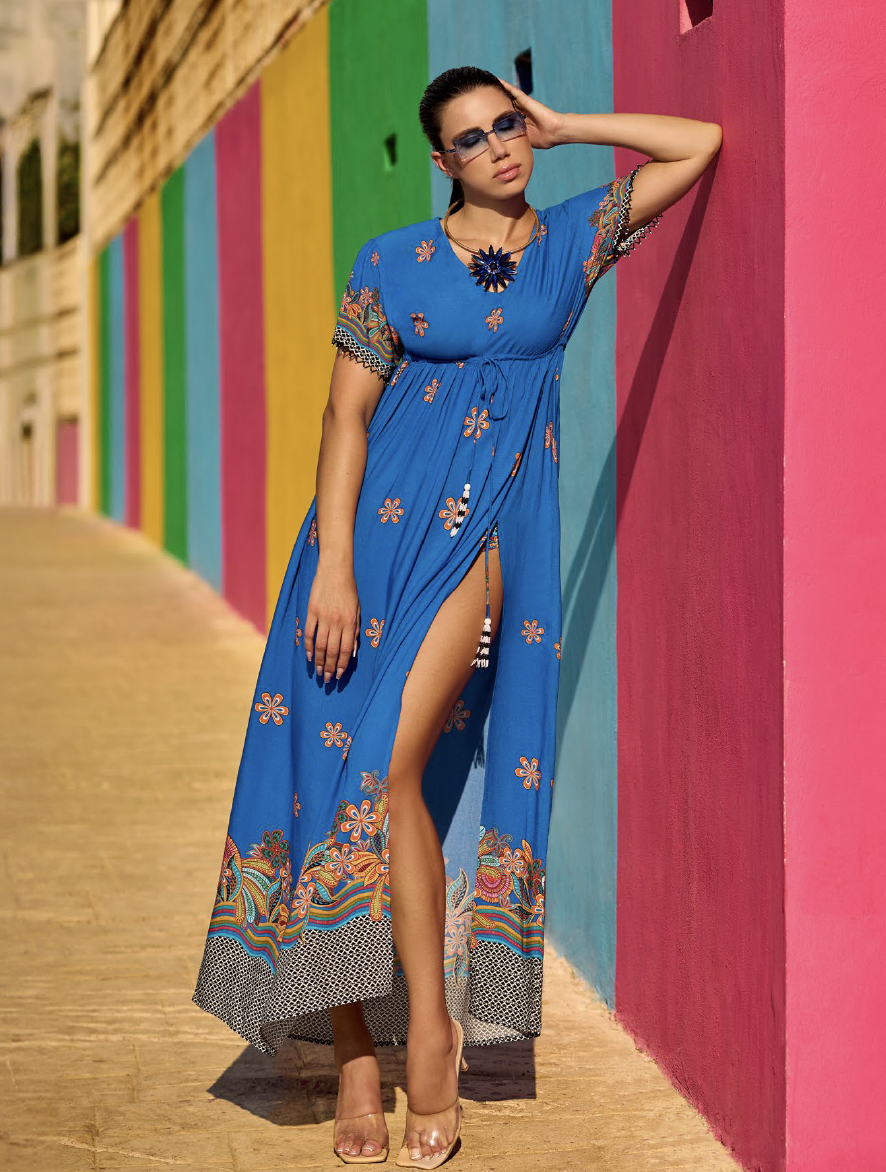 Il taglio รจ morbido e scivolato, con una lunghezza maxi che slancia la silhouette, mentre lo spacco laterale dona movimento e sensualitร , perfetto per affrontare le giornate calde con stile e freschezza. Le mezze maniche offrono una copertura leggera, ideale per chi cerca un equilibrio tra discrezione e libertร di movimento.