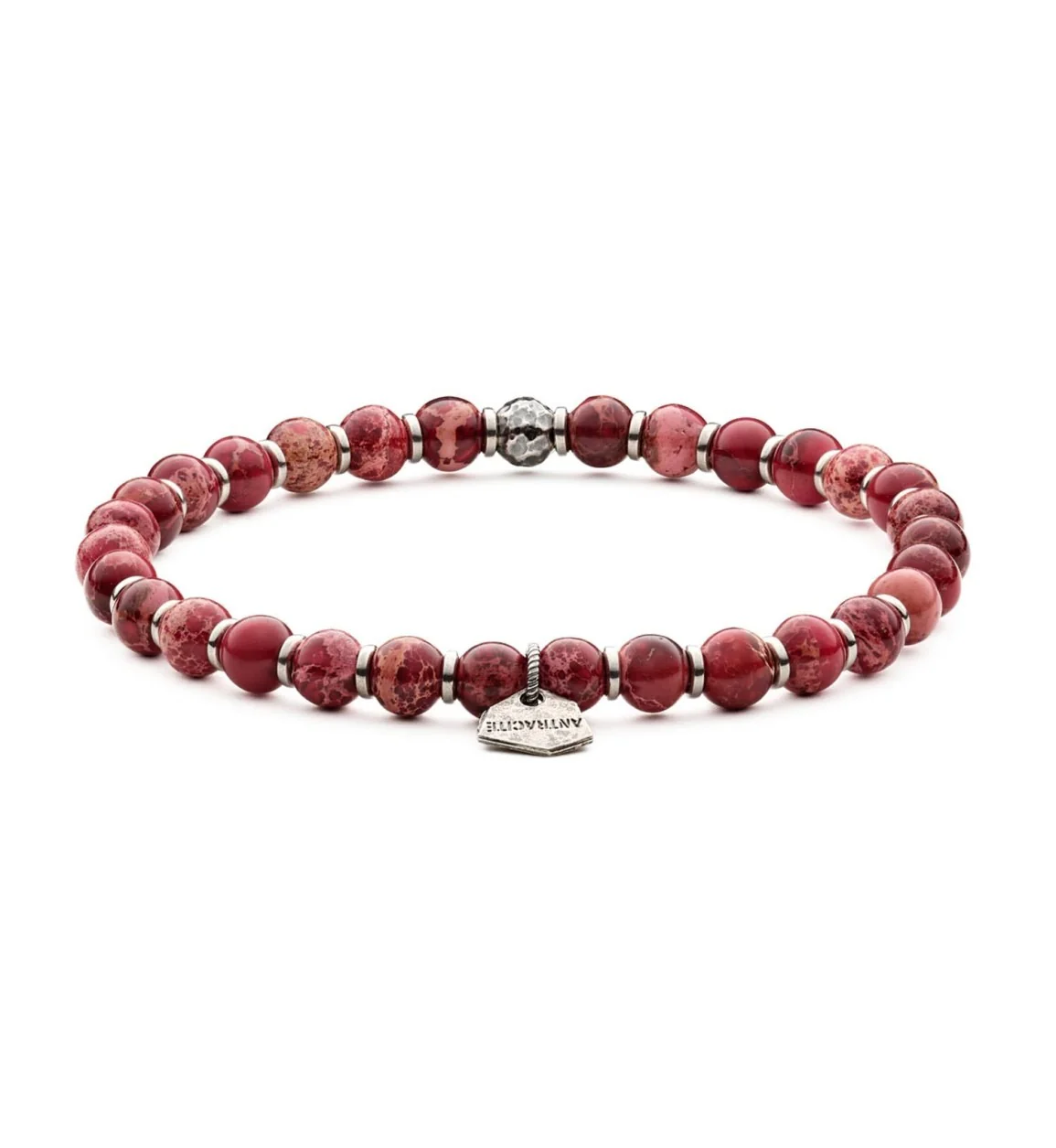 Bracciale in argento invecchiato 925 e pietre dure naturali da 6mm diaspro rosso. Ogni sfera รจ intervallata da sottili elementi in Argento 925โฐ il tutto impreziosito dal marchio Antracite impresso sulla targhetta esagonale. Il bracciale BABILONIA appartiene alla collezione Mono, รจ realizzato con un filo elastico in silicone trasparente molto resistente.