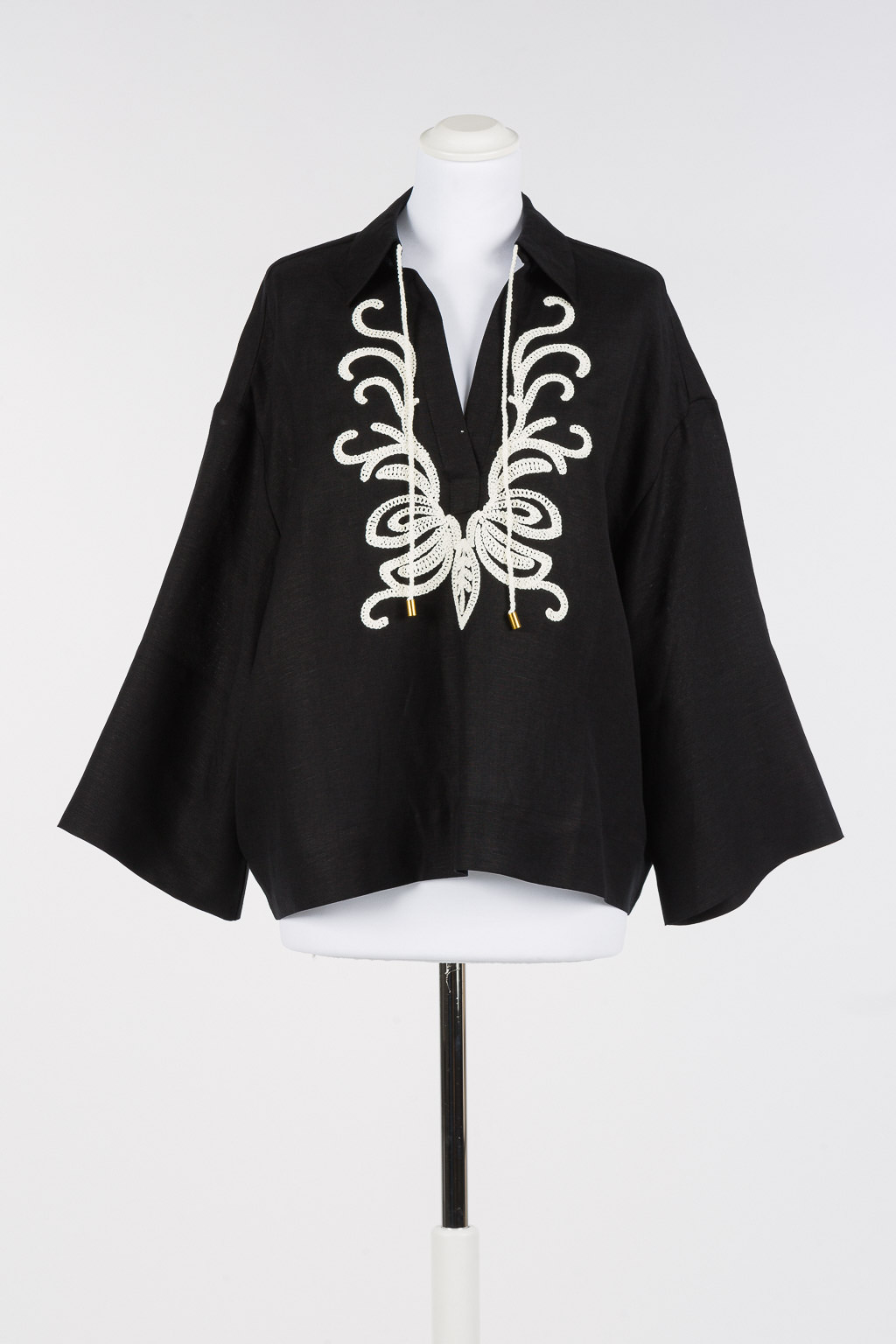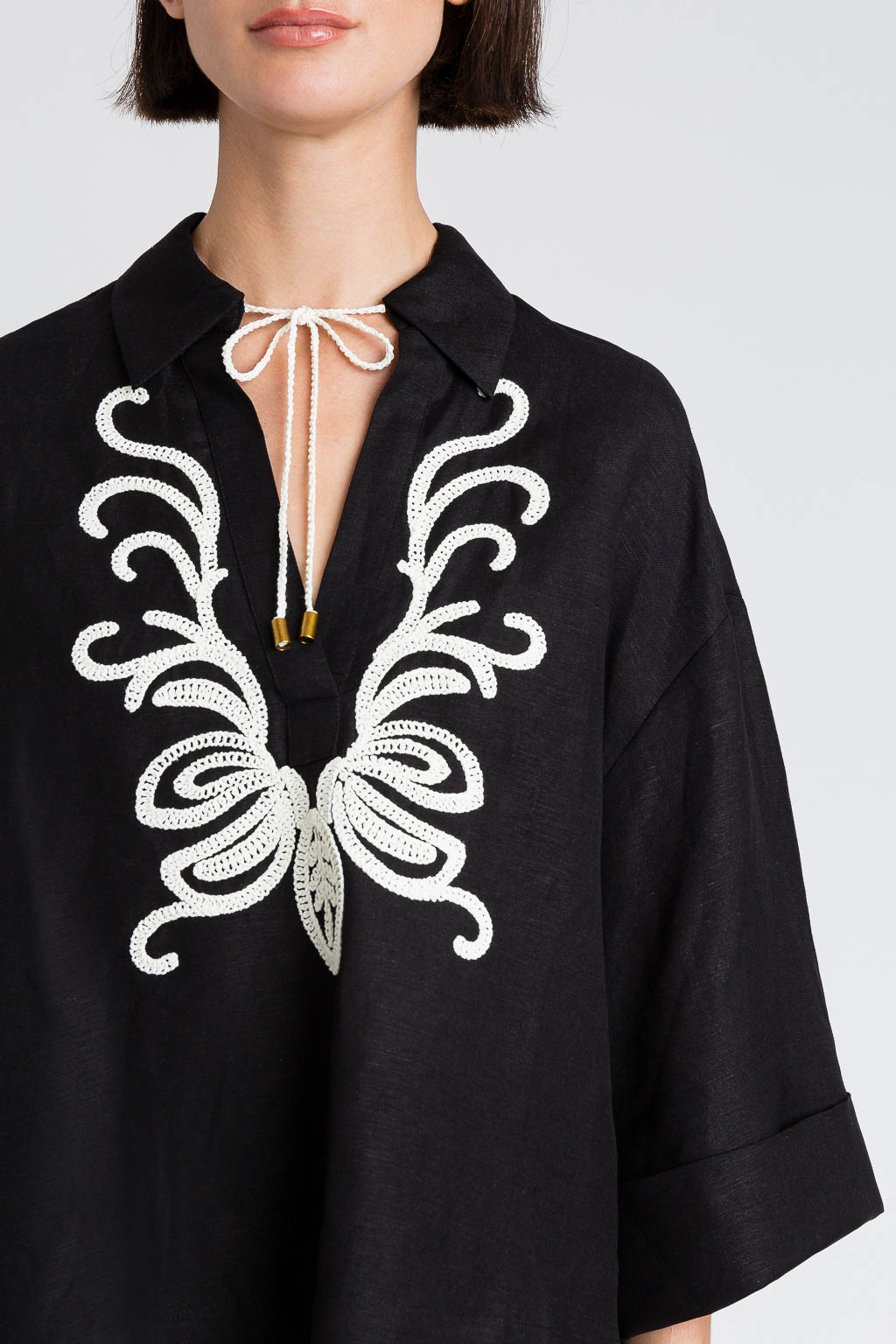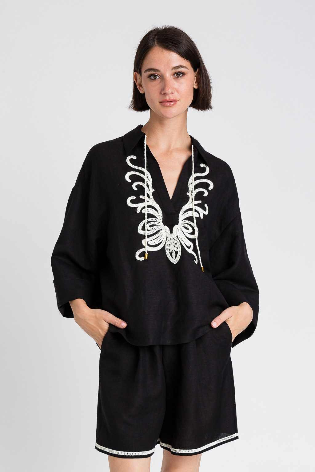 Il taglio classico è valorizzato da dettagli ricamati che aggiungono un tocco di personalità senza appesantire il design. Versatile e facile da abbinare, può essere indossata sia in contesti casual con jeans o pantaloni ampi, sia per occasioni più formali con gonne o outfit coordinati.