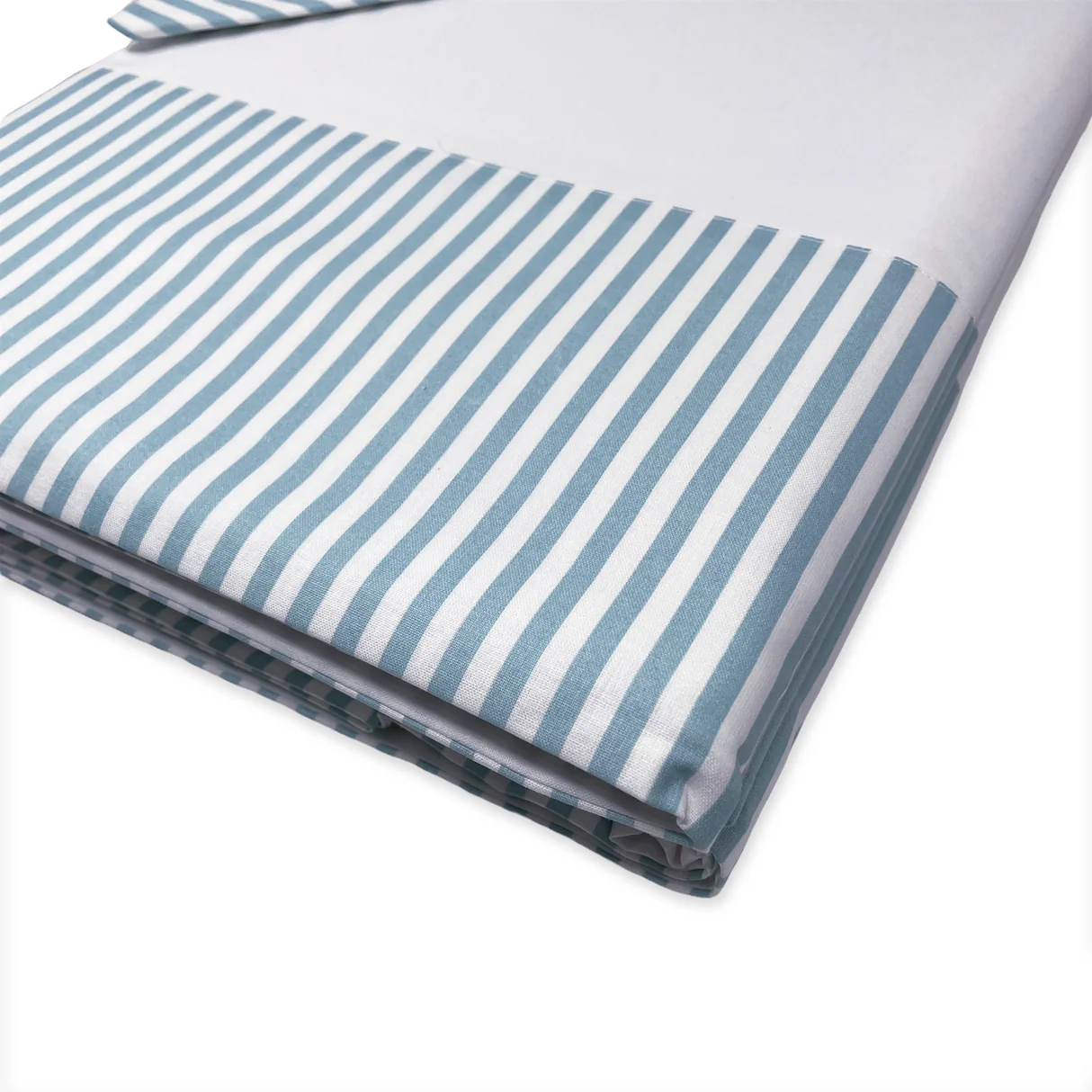 Completo lenzuola matrimoniale con fascia decorata a righe Misura: lenzuola sotto Mis. 180×200 cm altezza 30 cm lenzuolo sopra Mis. 260x290cm 2 federe Mis. 52×82 cm Composizione: cotone 100%