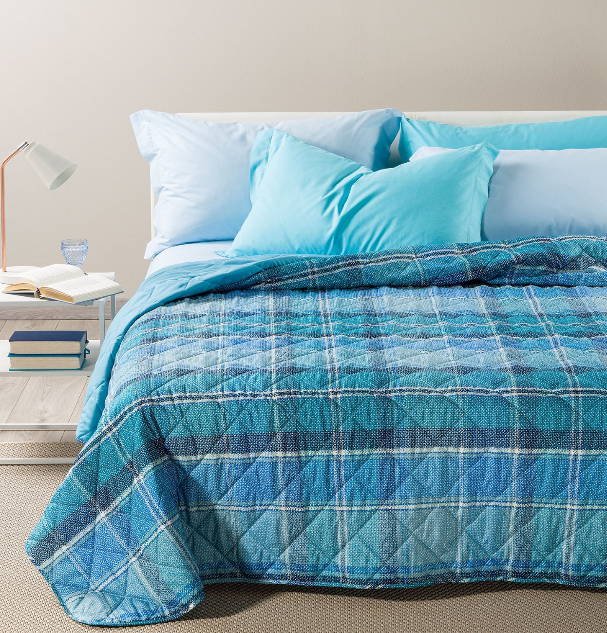 Copriletto trapuntato Caleffi Hilton una piazza 170×270 cm blu con stampa a quadri e imbottitura Sofy Original, leggero e perfetto per le mezze stagioni.