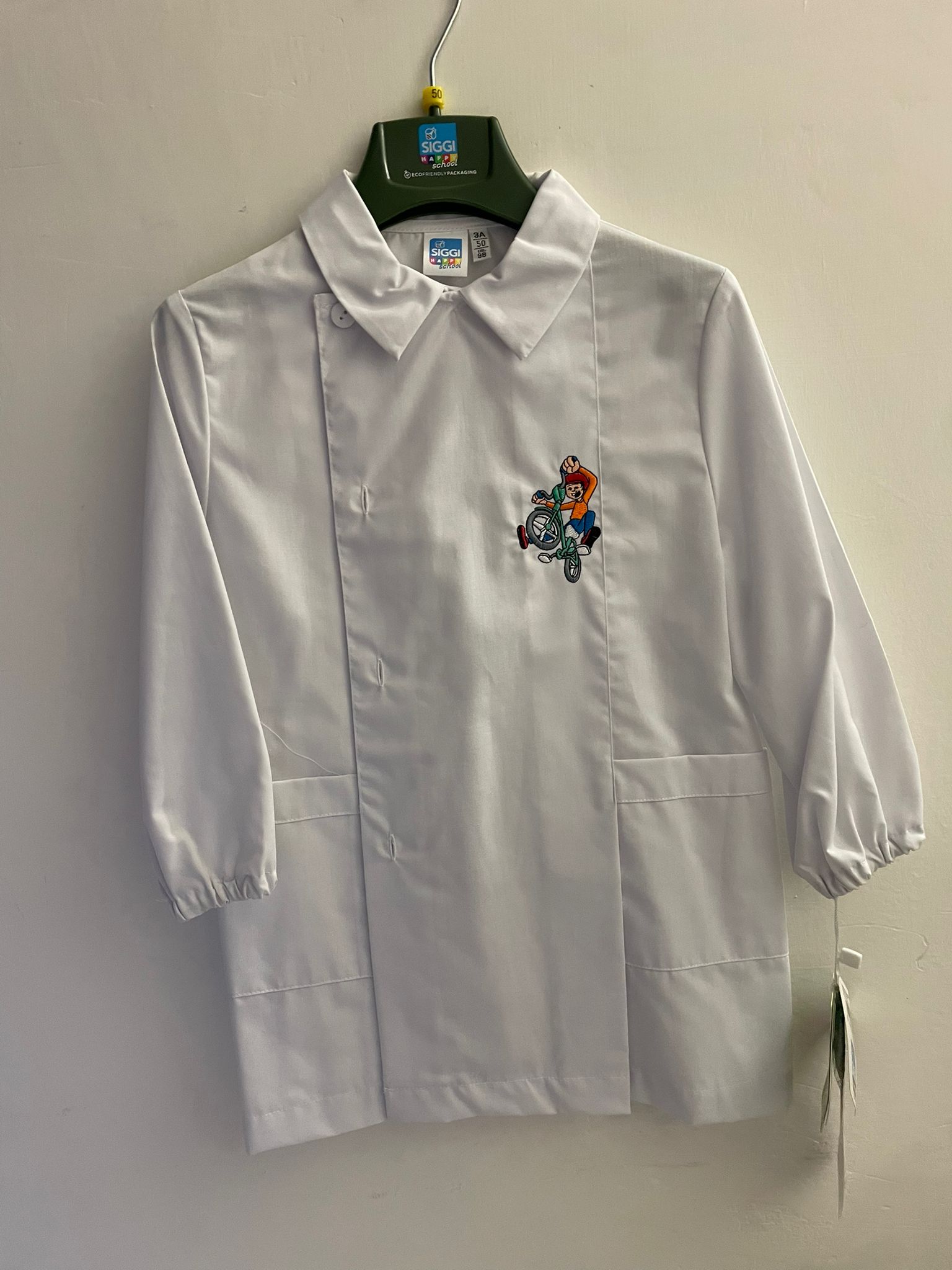 Grembiule asilo bianco con simpatico ricamo di bicicletta verde, ideale per i più piccoli. Realizzato in tessuto resistente e confortevole, è disponibile in taglia 3A ed è perfetto per unire praticità, comfort e un tocco di colore.