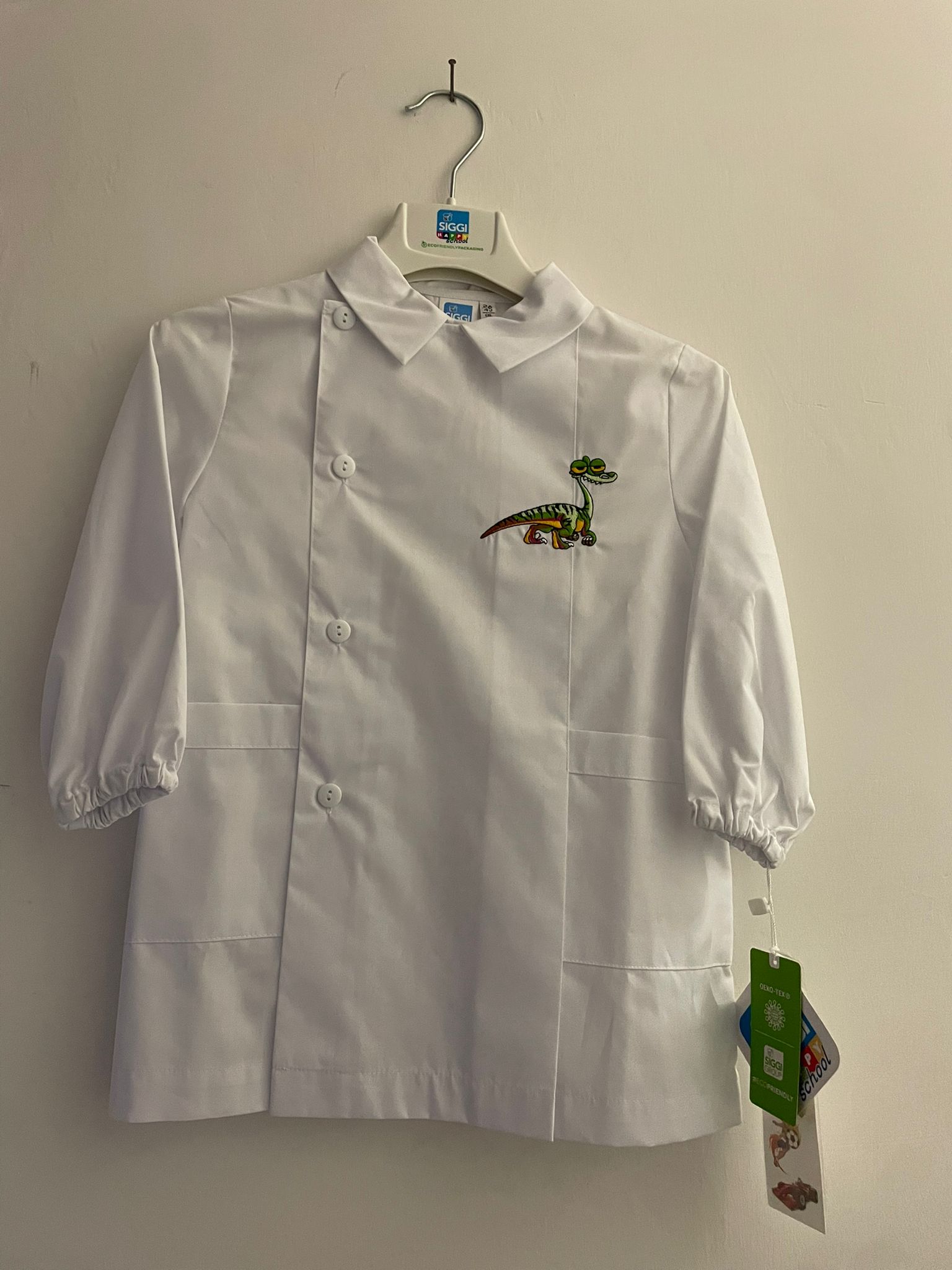 Grembiule asilo bianco con simpatico ricamo dinosauro, ideale per i più piccoli. Realizzato in tessuto resistente e confortevole, è perfetto per la scuola dell’infanzia. Disponibile in taglia 2A, unisce praticità, comfort e un design allegro.