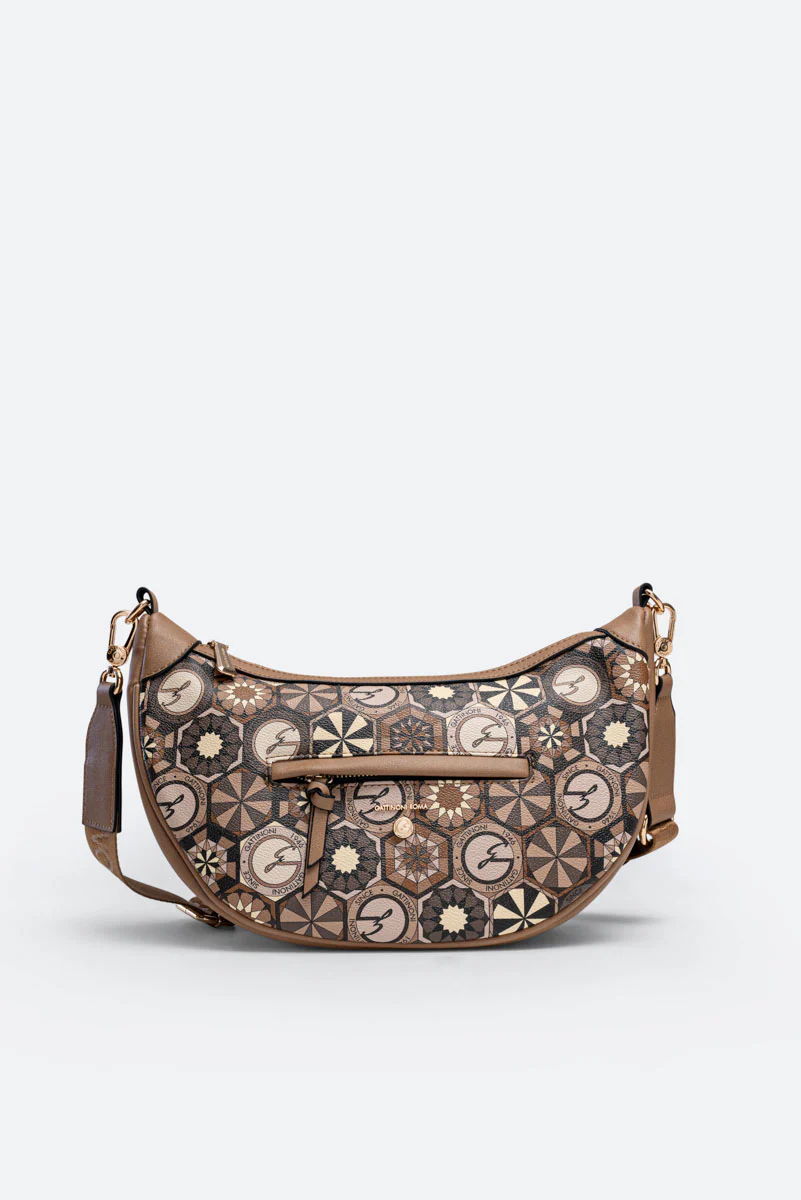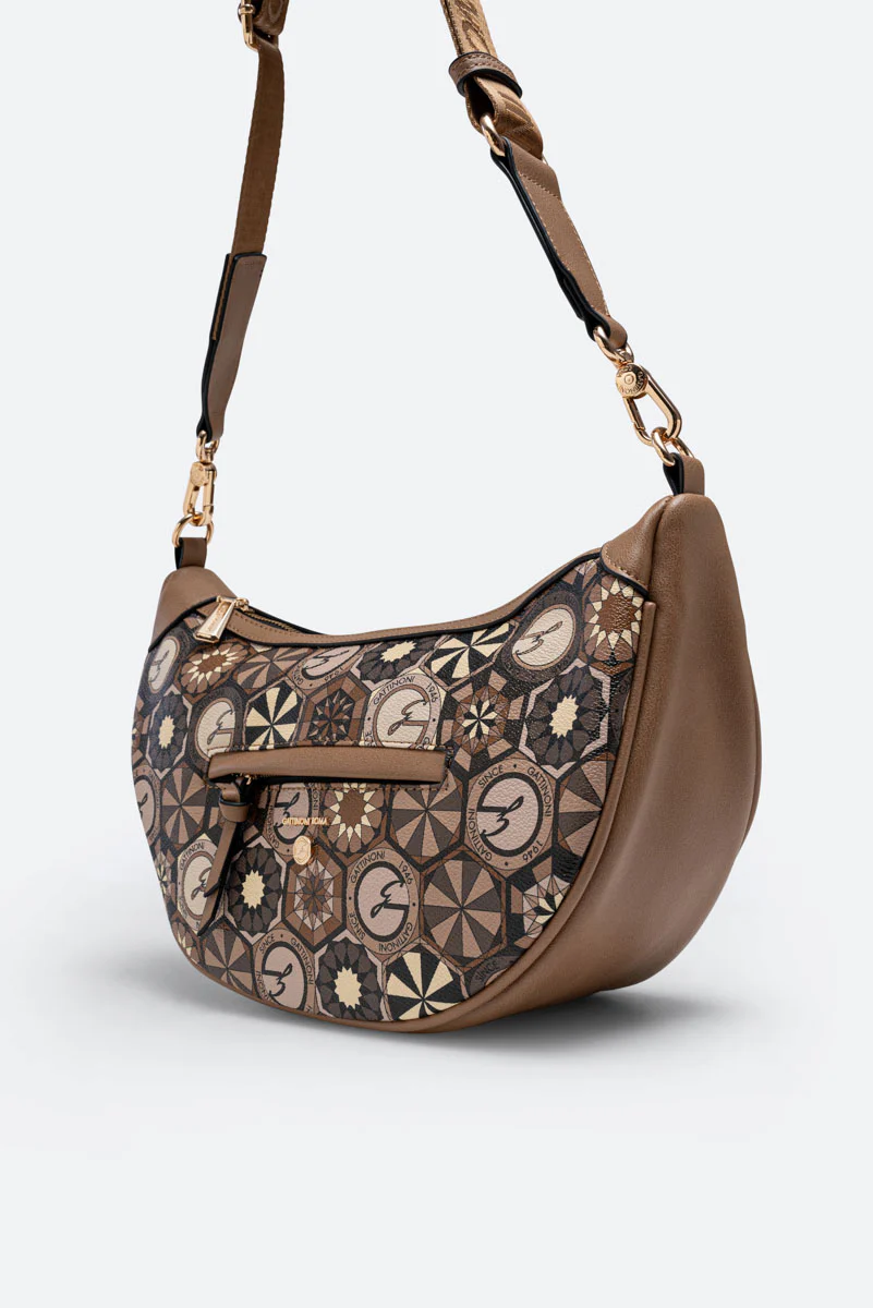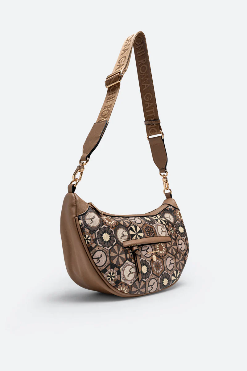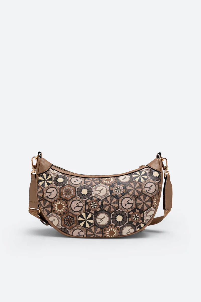 Borsa “Hobo” dalla classica forma a mezzaluna con dettagli in pelle sintetica e tessuto principale in tela spalmata e stampata Teodosia Desert.