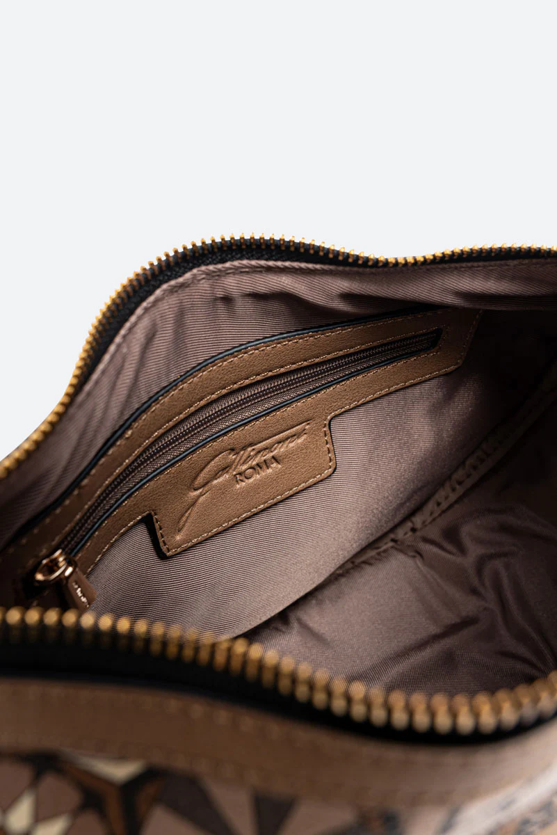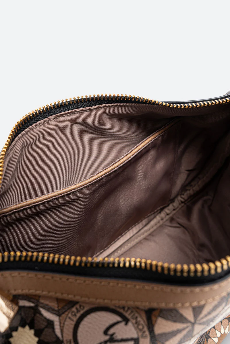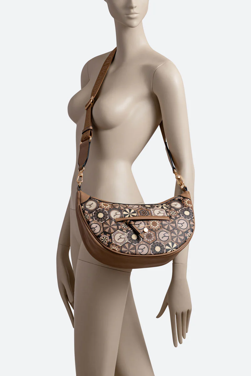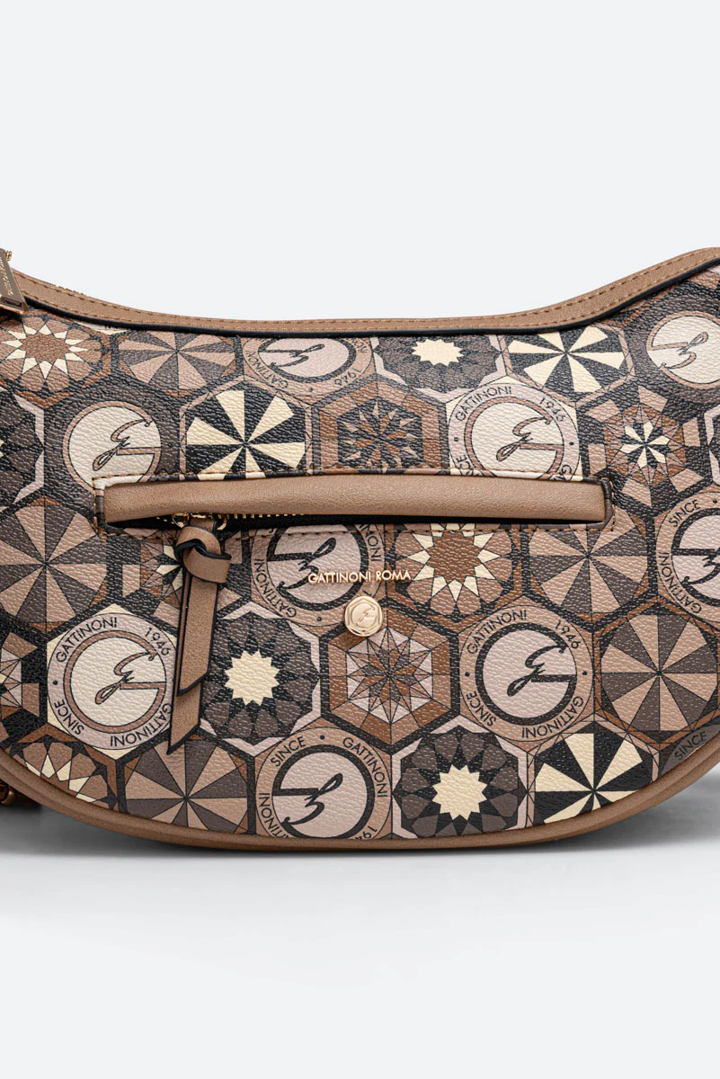 Borsa “Hobo” dalla classica forma a mezzaluna con dettagli in pelle sintetica e tessuto principale in tela spalmata e stampata Teodosia Desert.