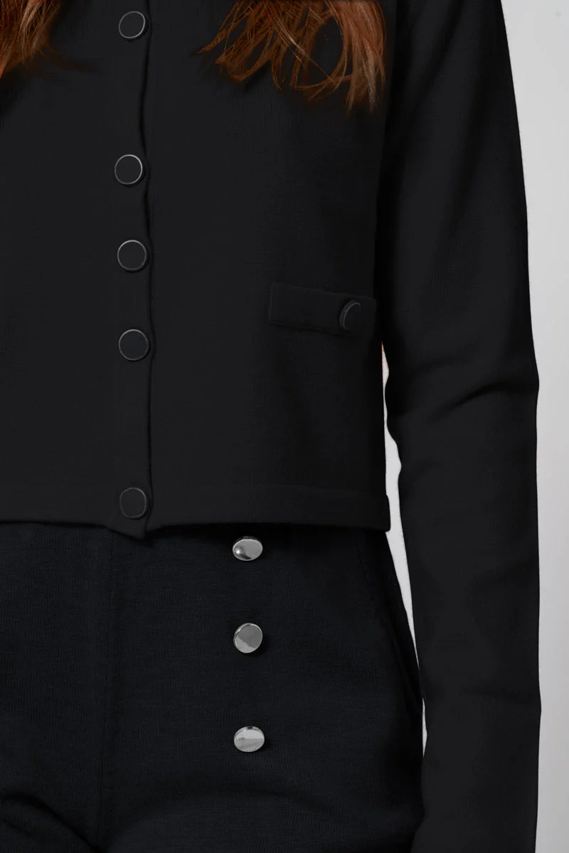 Cardigan corto in maglia tessuto con bottoni, scollo a giro e manica lunga con ricamo logo a filo.