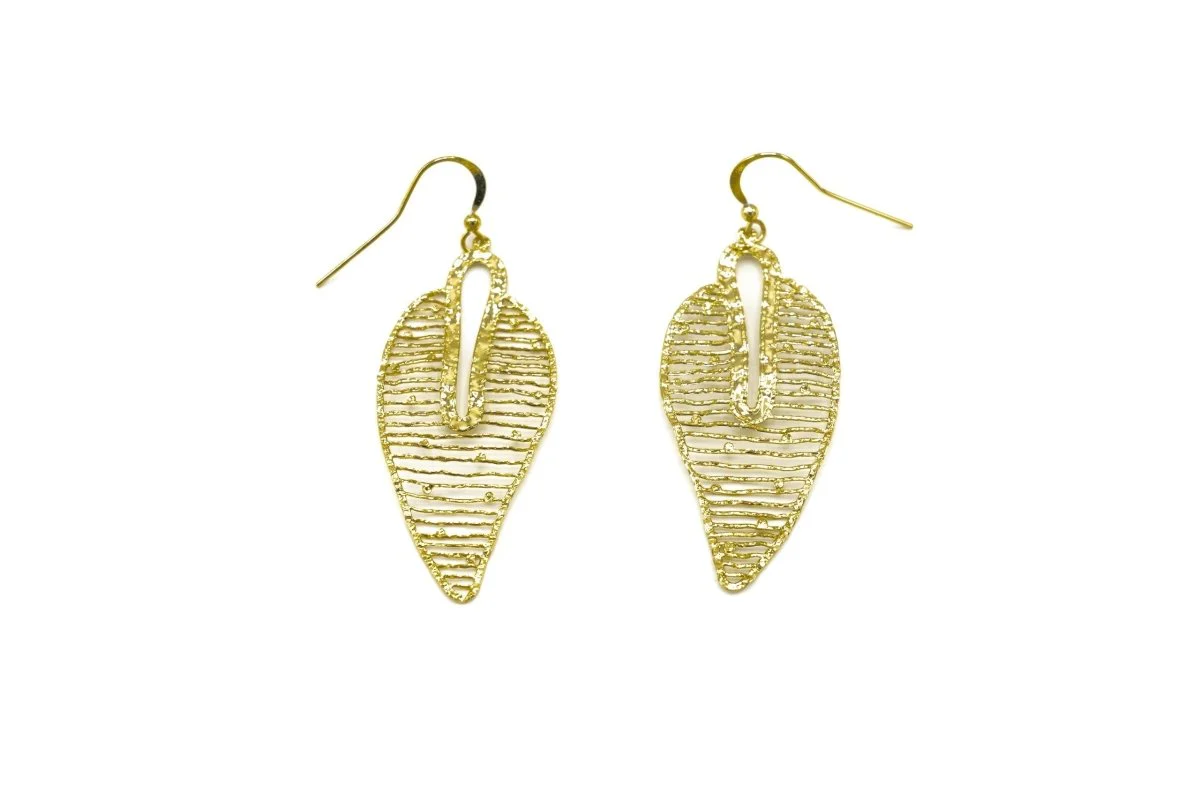 Orecchini pendenti con finitura galvanica lucida satinata. Molto leggeri. Altezza: 5,5 cm Materiale: ottone con finitura galvanica in oro Codice: JU1423