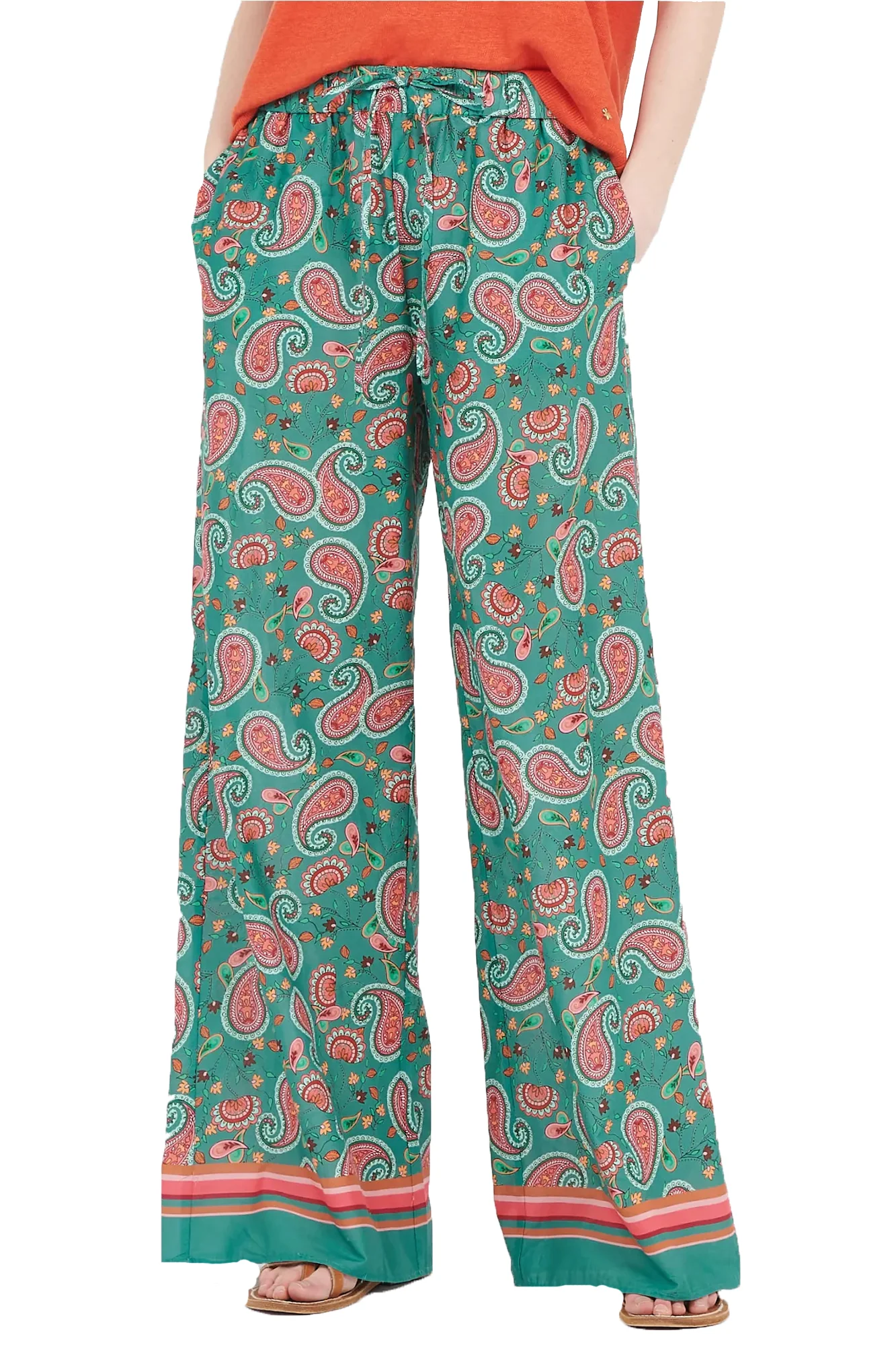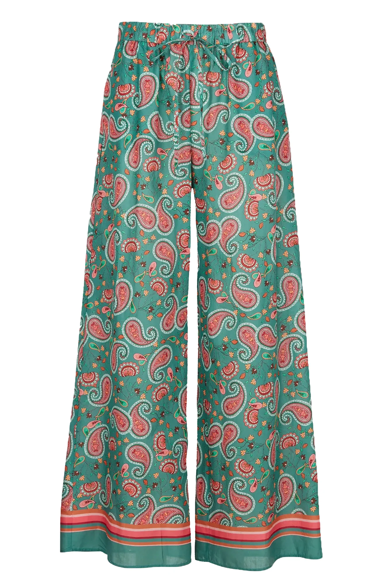 Pantalone largo da donna a fantasia con elastico in vita e 2 tasche laterali.