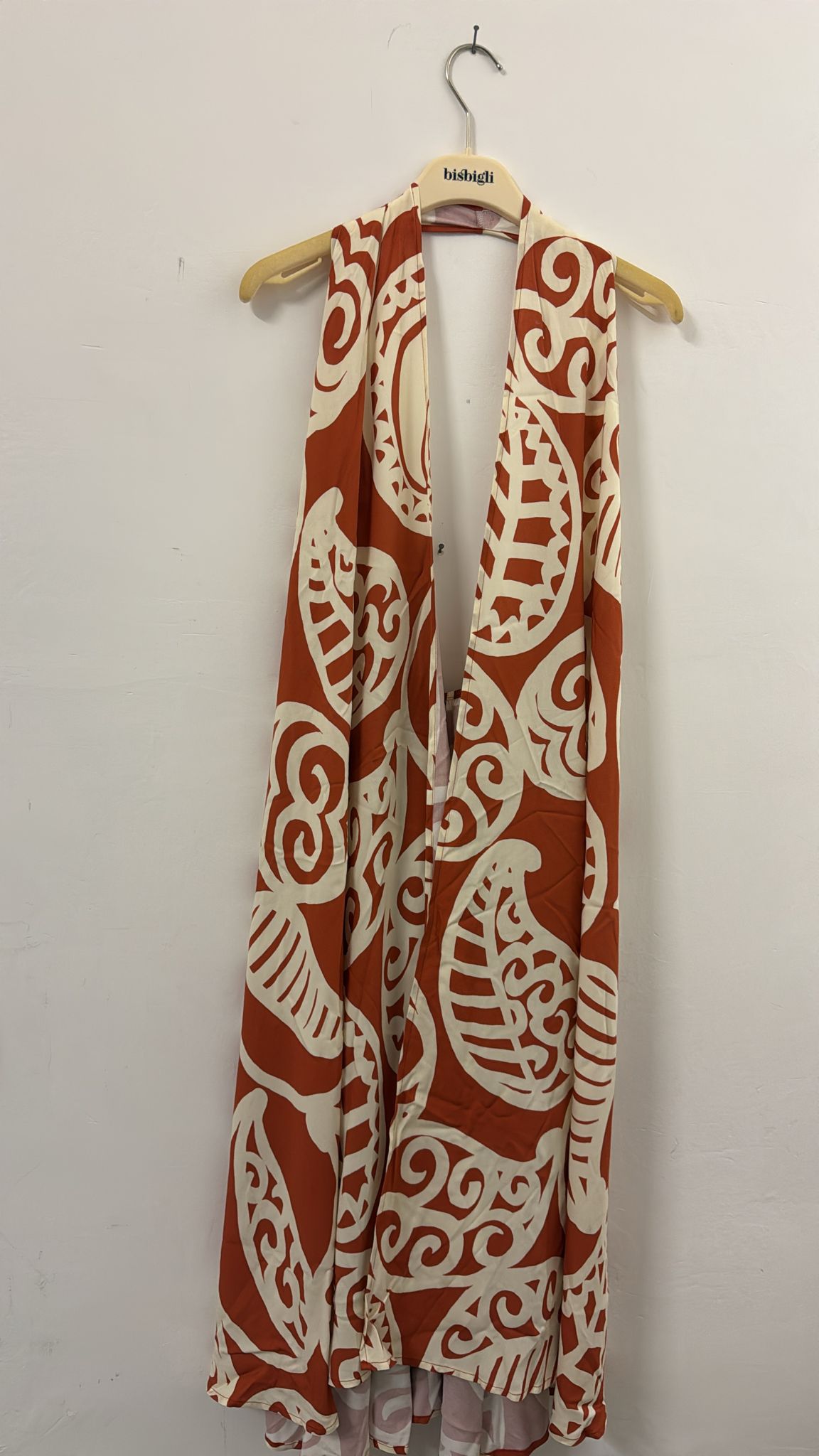 Pareo strutturato ad abito con schiena scoperta, portabile aperto come cardigan o chiuso con cintura. Fantasia nei colori della terra, versatile ed elegante.
