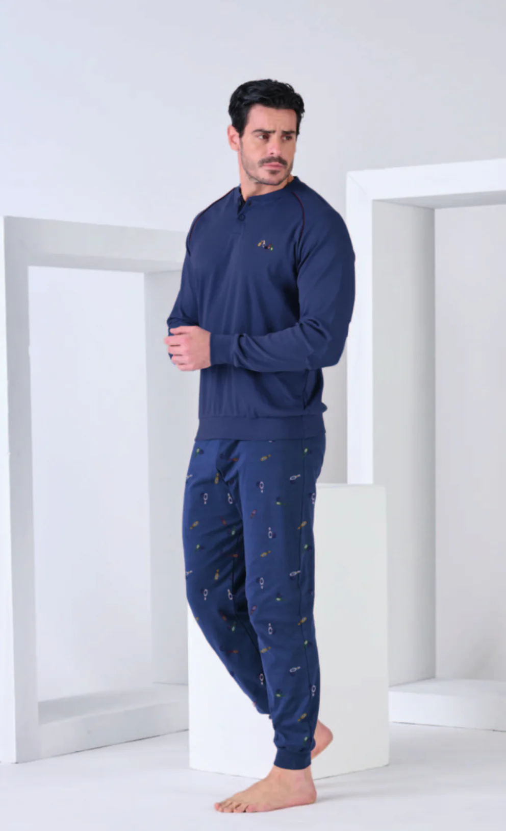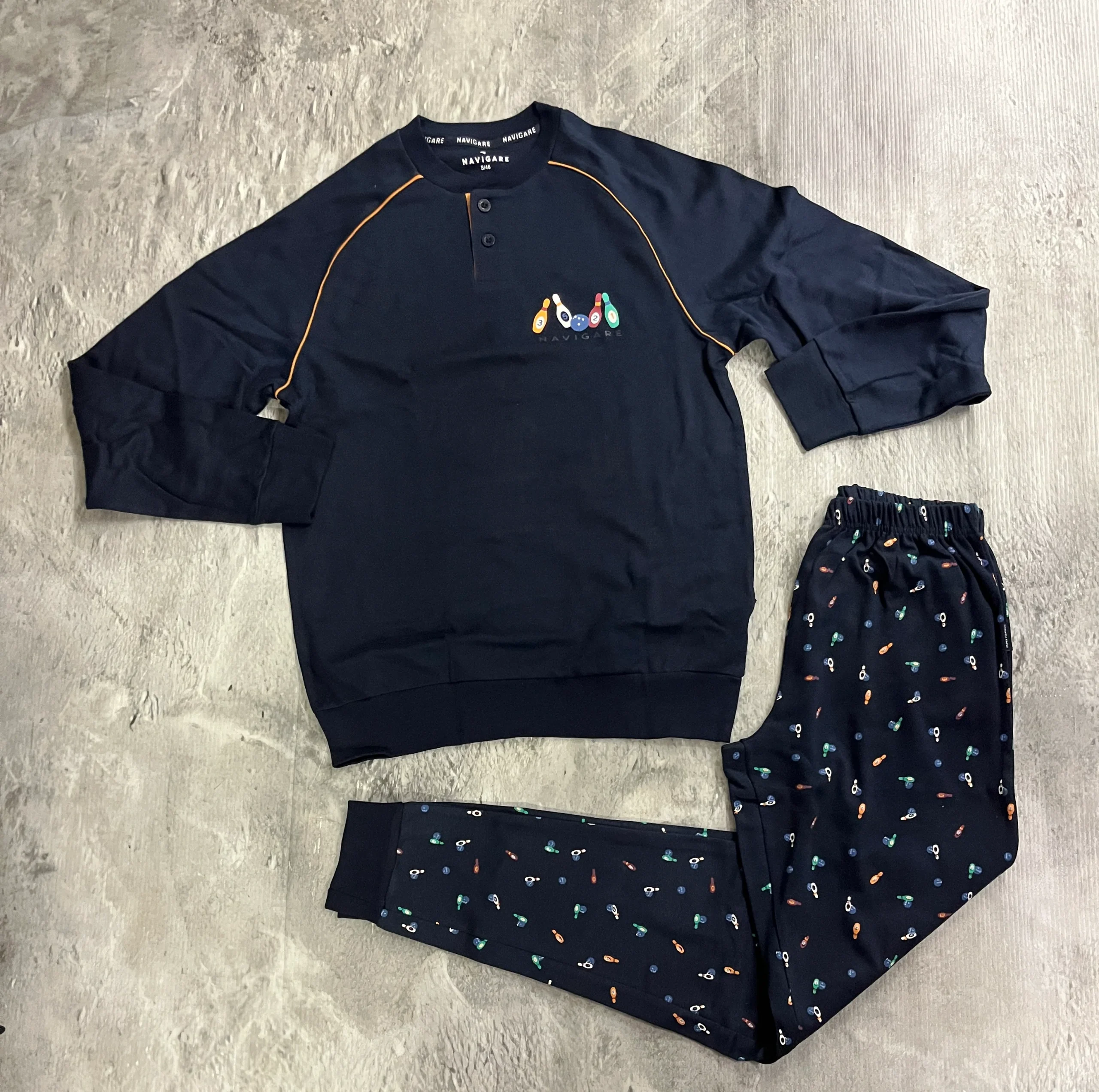 Pigiama uomo lungo in caldo cotone. Maglia monocolore a girocollo con 2 bottoncini, piccola stampa a tema bowling sul petto, polso al fondo e polsini sulle maniche. Pantalone in fantasia birilli, con morbido elastico in vita, tasca sul retro e polsini al fondo. Art 141956