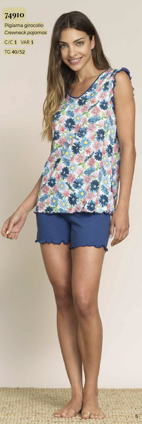 Pigiama girocollo spalla larga e pantaloncino corto con maglia a fantasia e pantalone in tinta unita.