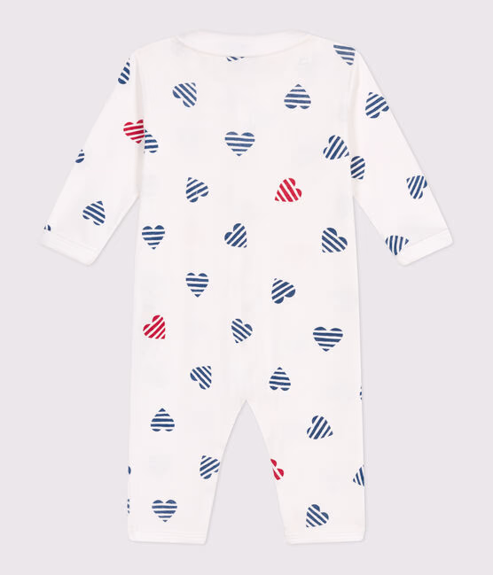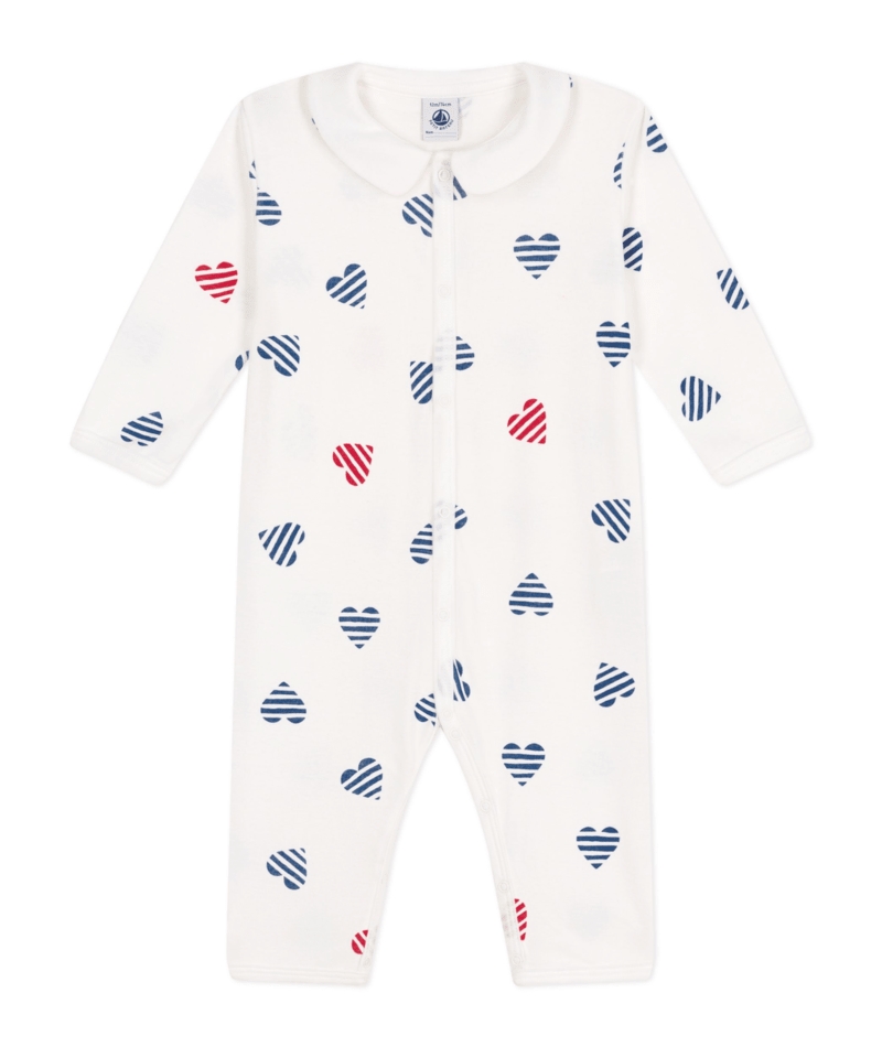 Dors-bien mixte en cรดte 1X1, une matiรจre extensible et confortable. Nuova stampa a tre cuori! La nostra iconica mariniรจre si unisce al cuore! Il colletto dona un tocco ancora piรน raffinato al pigiama. Apertura con automatici sul davanti e all’interno gambe. Pigiama disponibile anche per mamma e bambino, per un perfetto look abbinato.