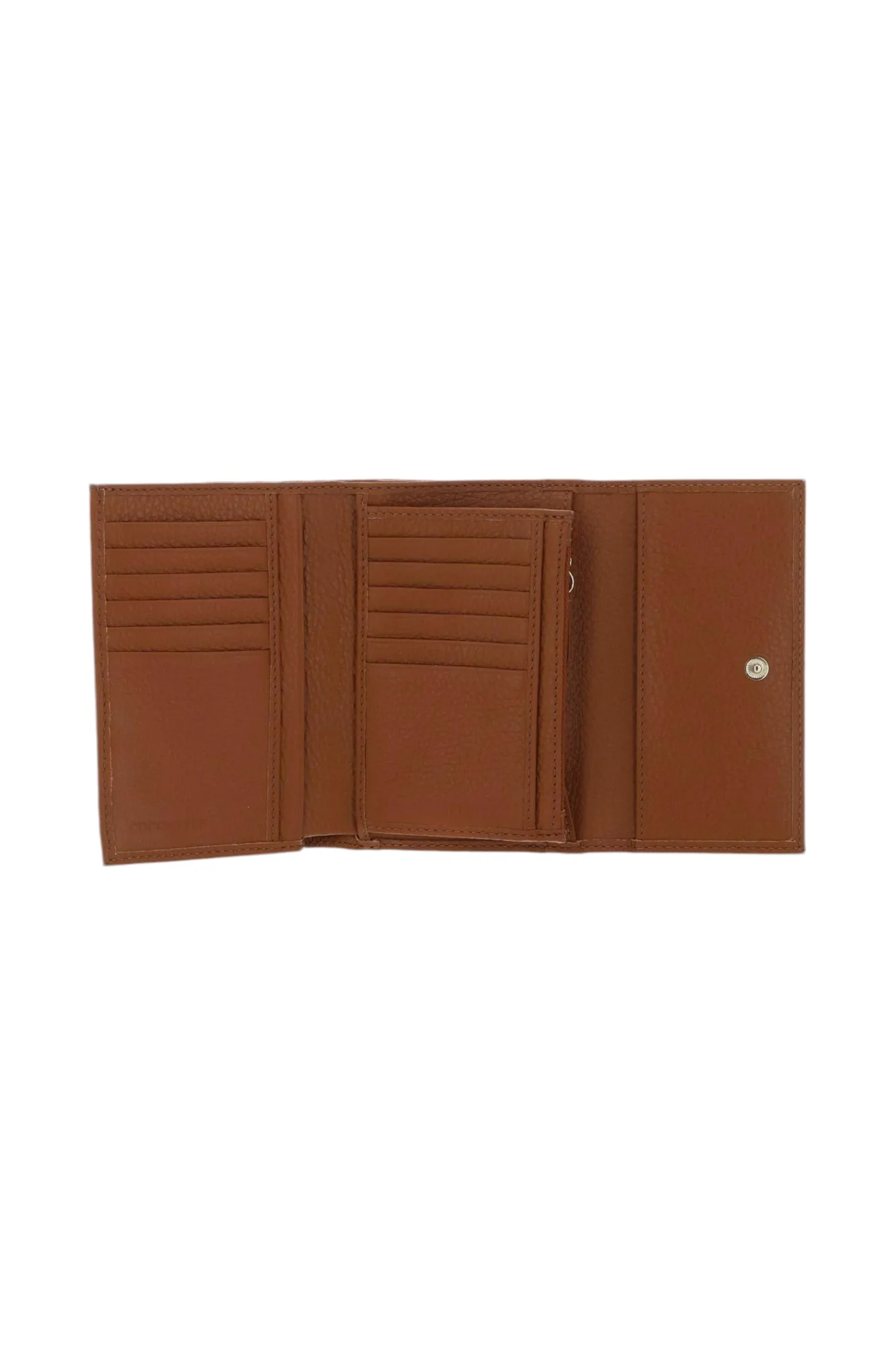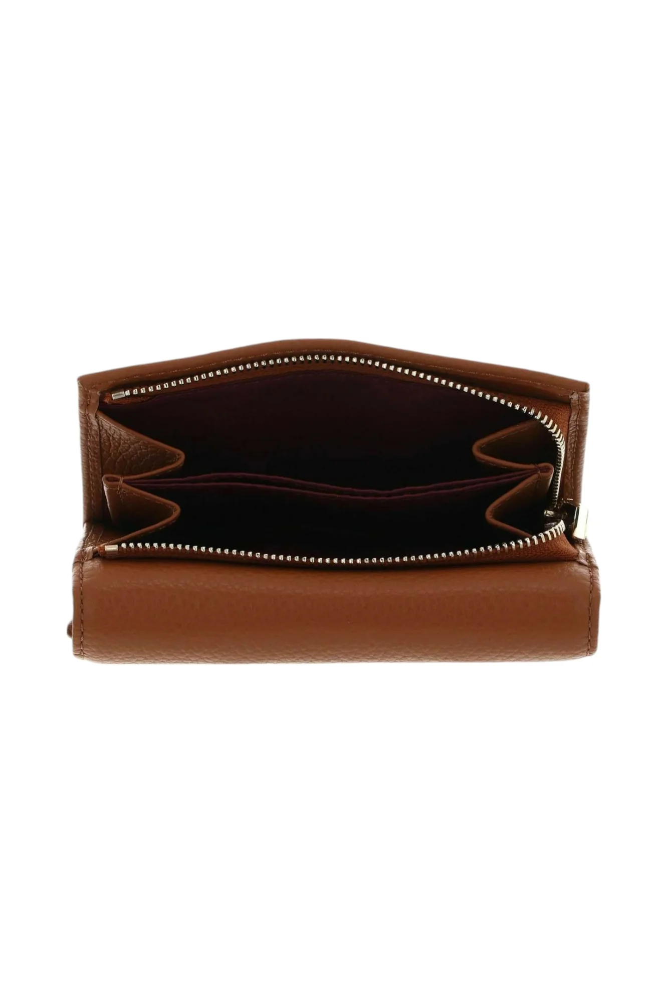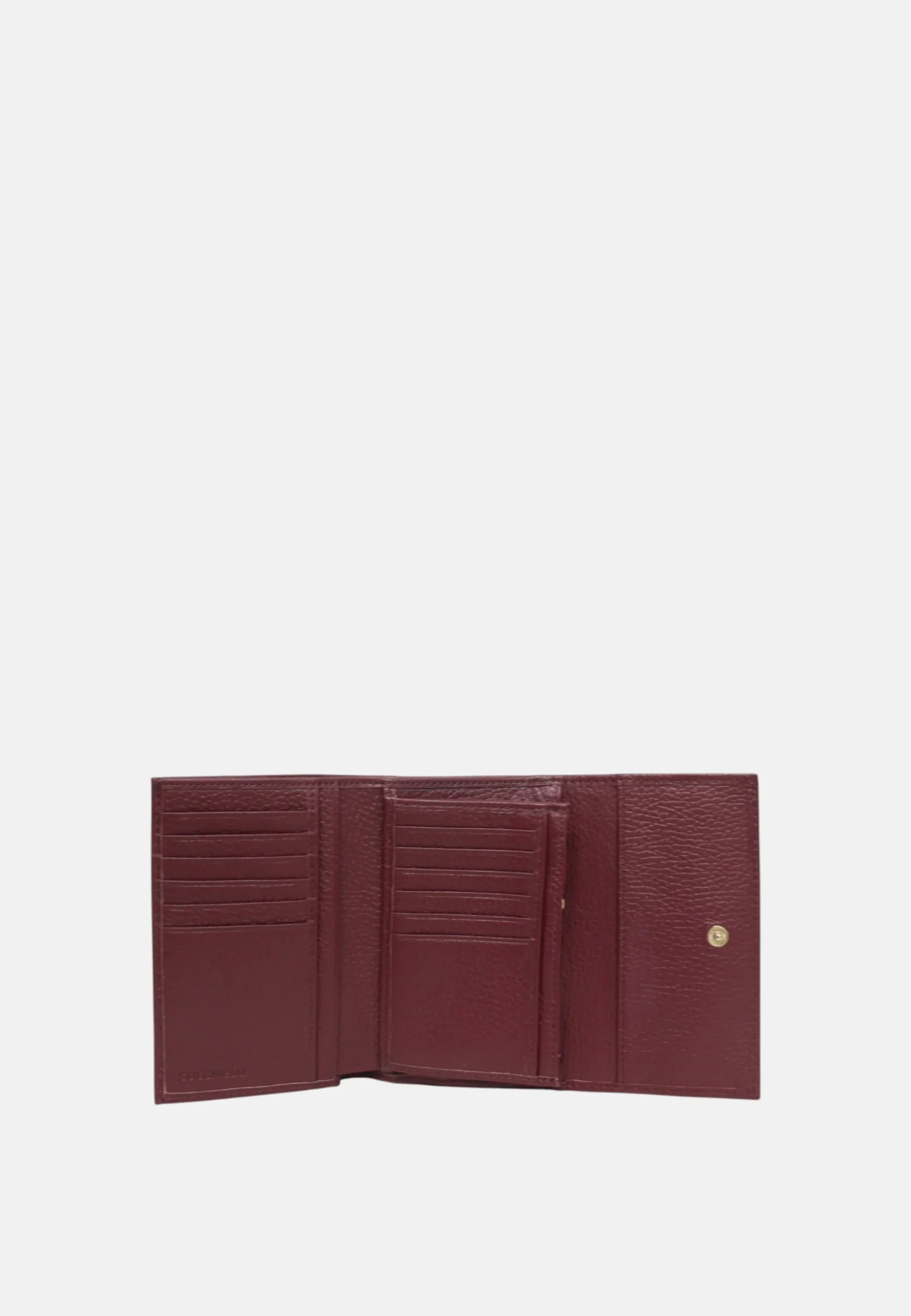 Portafoglio da donna in pelle, chiusura centrale con clip e scomparto posteriore porta monete chiuso con zip, all’interno si presenta con 12 tasche porta carte, 3 multiuso e 1 porta banconote.