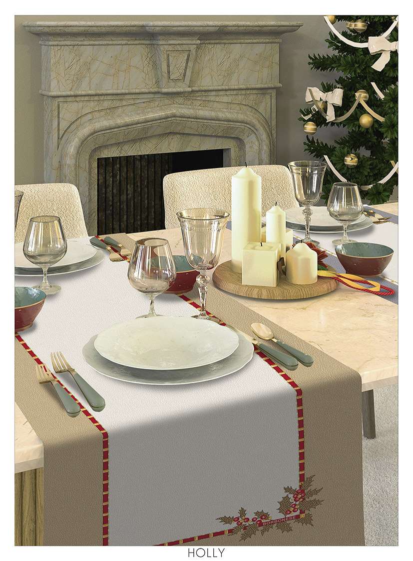 Decora la tua tavola con eleganza grazie al Runner Natalizio Borbonese Holly. Realizzato in 100% cotone, presenta un raffinato design a tema natalizio nella tonalità nocciola. Con dimensioni di 50×150 cm, è perfetto per impreziosire pranzi e cene festive, unendo stile e qualità .