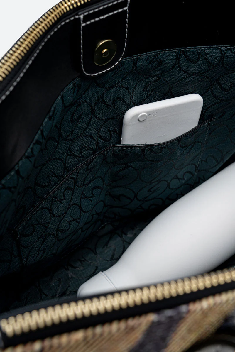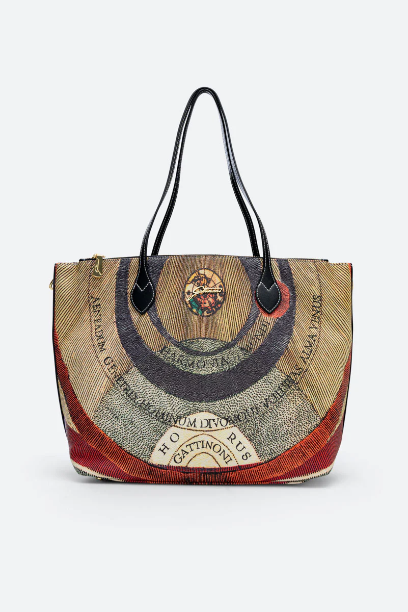 Borsa shopping nell’iconico materiale stampato Planetarium, con fodera logata e dettagli in pelle.