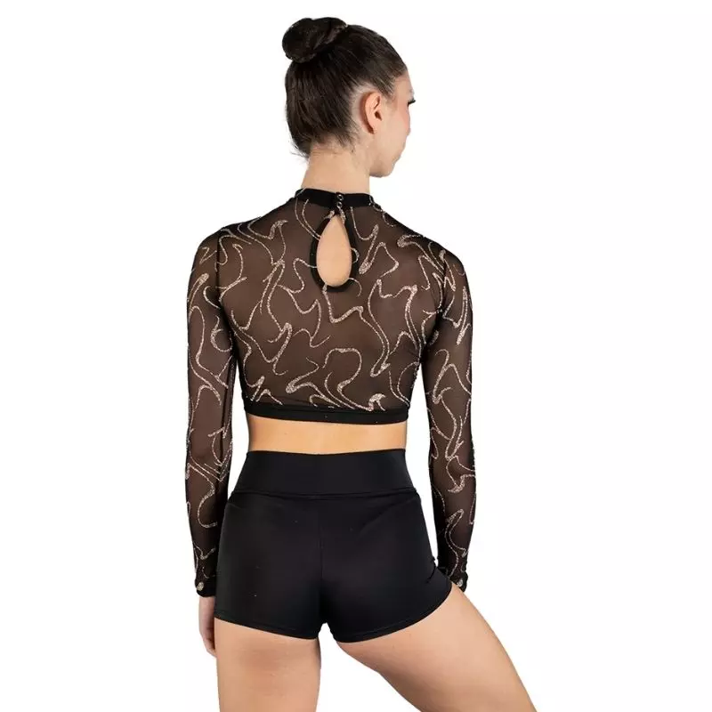 Questo elegante top in rete ricamata รจ un capo unico e sofisticato, perfetto per completare qualsiasi outfit da danza o spettacolo. Rete Ricamata con Motivo Decorativo: La rete trasparente รจ impreziosita da dettagli ricamati che donano un tocco glamour. Maniche Lunghe: Ideali per aggiungere eleganza e copertura senza rinunciare alla leggerezza. Apertura Posteriore con Bottone: Un dettaglio funzionale che facilita la vestibilitร e aggiunge raffinatezza al design. Taglio Corto: Perfetto per abbinamenti con short o pantaloni a vita alta, garantendo un look moderno. Tessuto Elasticizzato: Si adatta alle forme del corpo offrendo comfort e libertร di movimento.