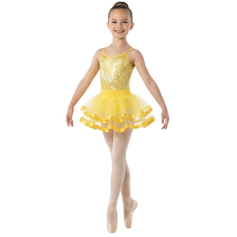 Il Tutù Honey Pop è pensato per i saggi: in scena deve essere ben visibile, restare ordinato e mantenere la forma anche con cambi di direzione, salti e giri. Il corpetto effetto Honey crea un impatto luminoso sotto le luci, mentre il gonnellino a ruota in 2 strati di tulle rigido mantiene volume e struttura per tutta la coreografia. La rifinitura con nastro raso da 2,5 cm definisce il bordo e aiuta la linea a risultare pulita anche da lontano. Lunghezza mezza coscia: scelta pratica per scuole e insegnanti che vogliono uniformità visiva sul gruppo. Caratteristiche Corpetto: effetto Honey Gonnellino:…