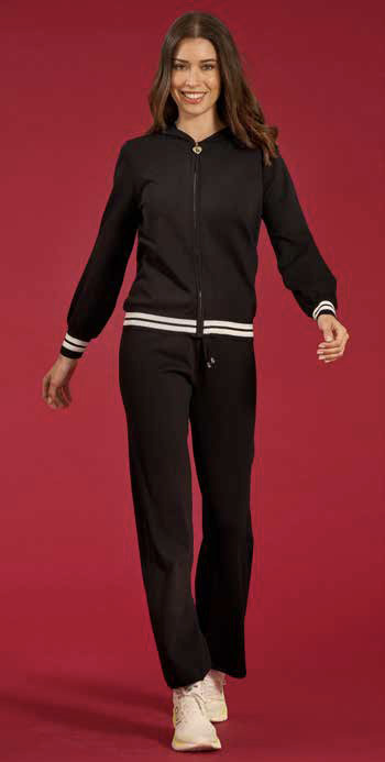 Il pantalone dal taglio ampio regala una vestibilità morbida e fluida, garantendo libertà di movimento e un look sofisticato anche nei momenti più rilassati. La felpa con chiusura a zip e cappuccio aggiunge praticità e versatilità, perfetta per essere indossata aperta su una t-shirt o chiusa per un effetto avvolgente e caldo.